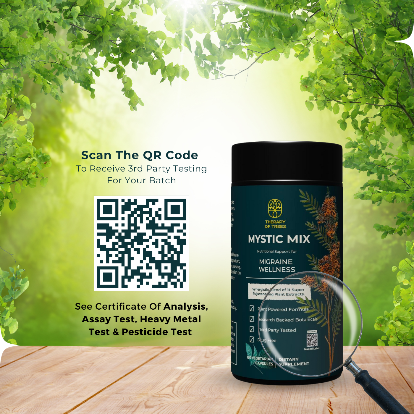 At Therapy of Trees, we stand by the purity of our 100% plant-based formulations. Each ingredient is rigorously tested and our final products undergo stringent third-party assessments for purity, potency, and safety. Our commitment to transparency is absolute—no fillers, no chemicals, no allergens, just nature's bounty. For full disclosure, simply scan the QR code on our products to access a detailed ingredient list and test results. Your trust is our promise.