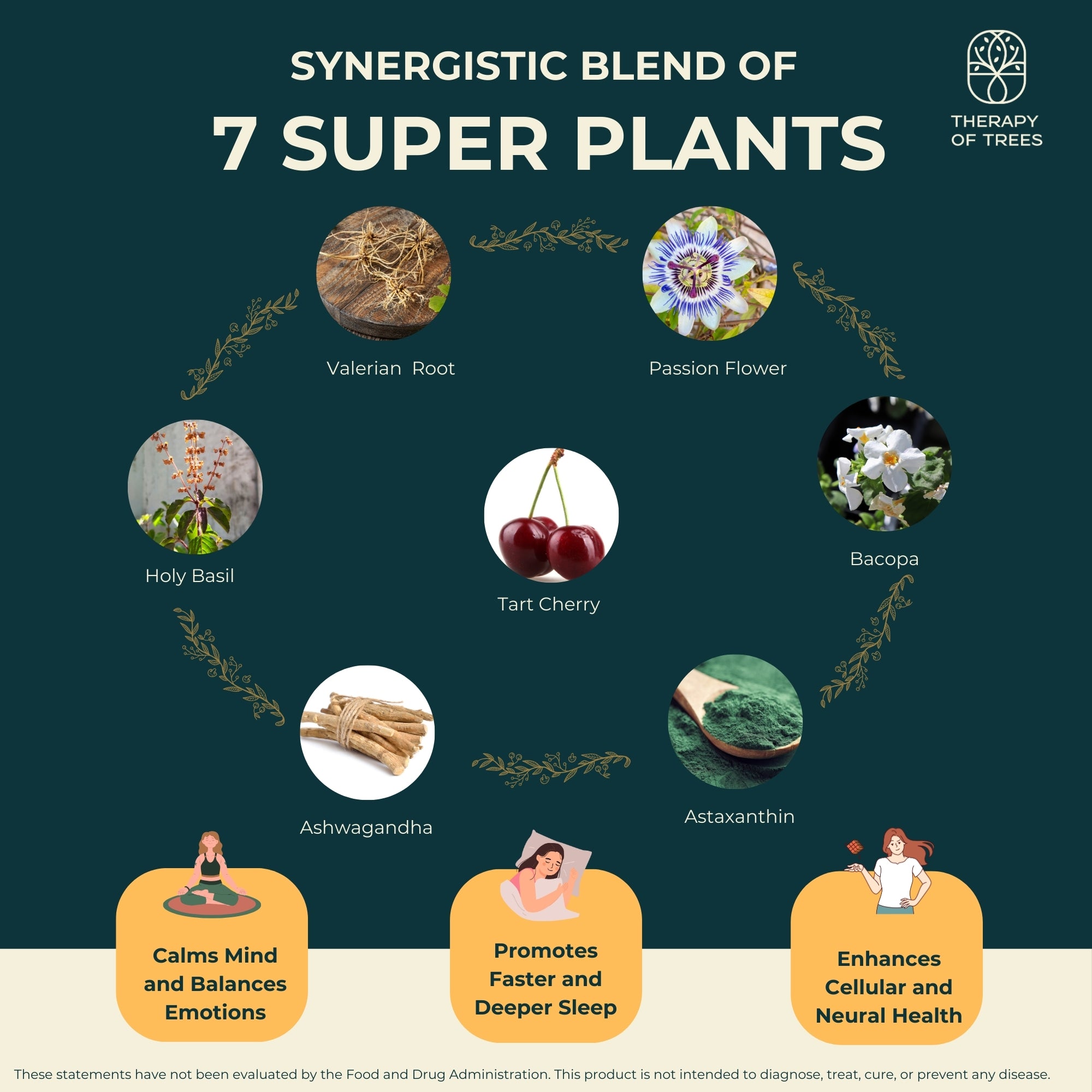 The combination of Valerian, Passion Flower, Ashwagandha, Bacopa, Holy Basil, and Astaxanthin work synergistically to promote deeper, restful sleep, calm the mind, balance stress hormones, boost cognitive function, and act as a natural adaptogen for stress relief. Each ingredient is selected for its science-backed health benefits in optimizing overall well-being.