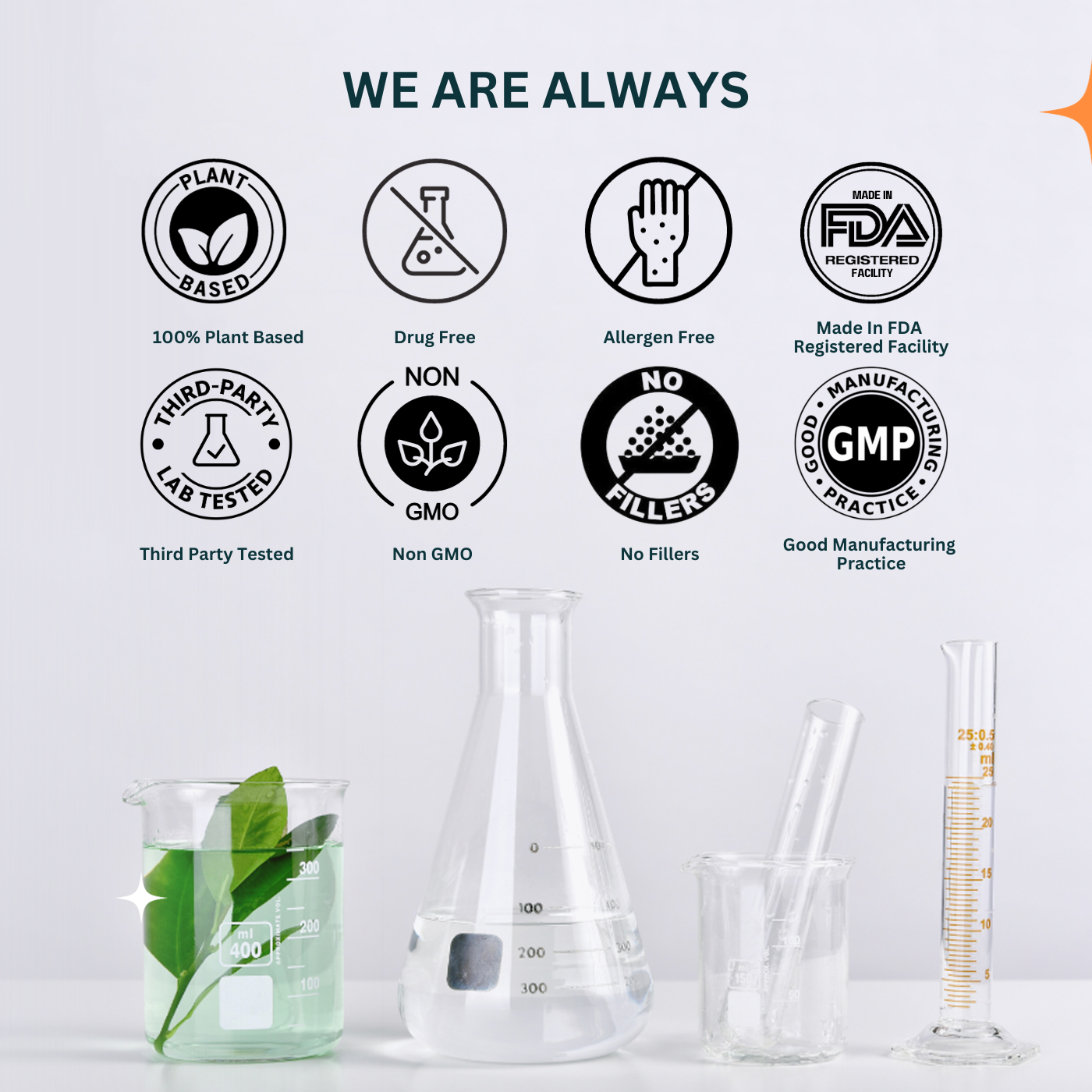 We take both quality and safety very seriously. That’s why all of our products are 3rd Party tested for heavy metals, pesticides, microbial contamination and active compounds, before and after being packaged in our FDA Registered facility. We make no-BS products free of Fillers, synthetic chemicals, and common allergens.