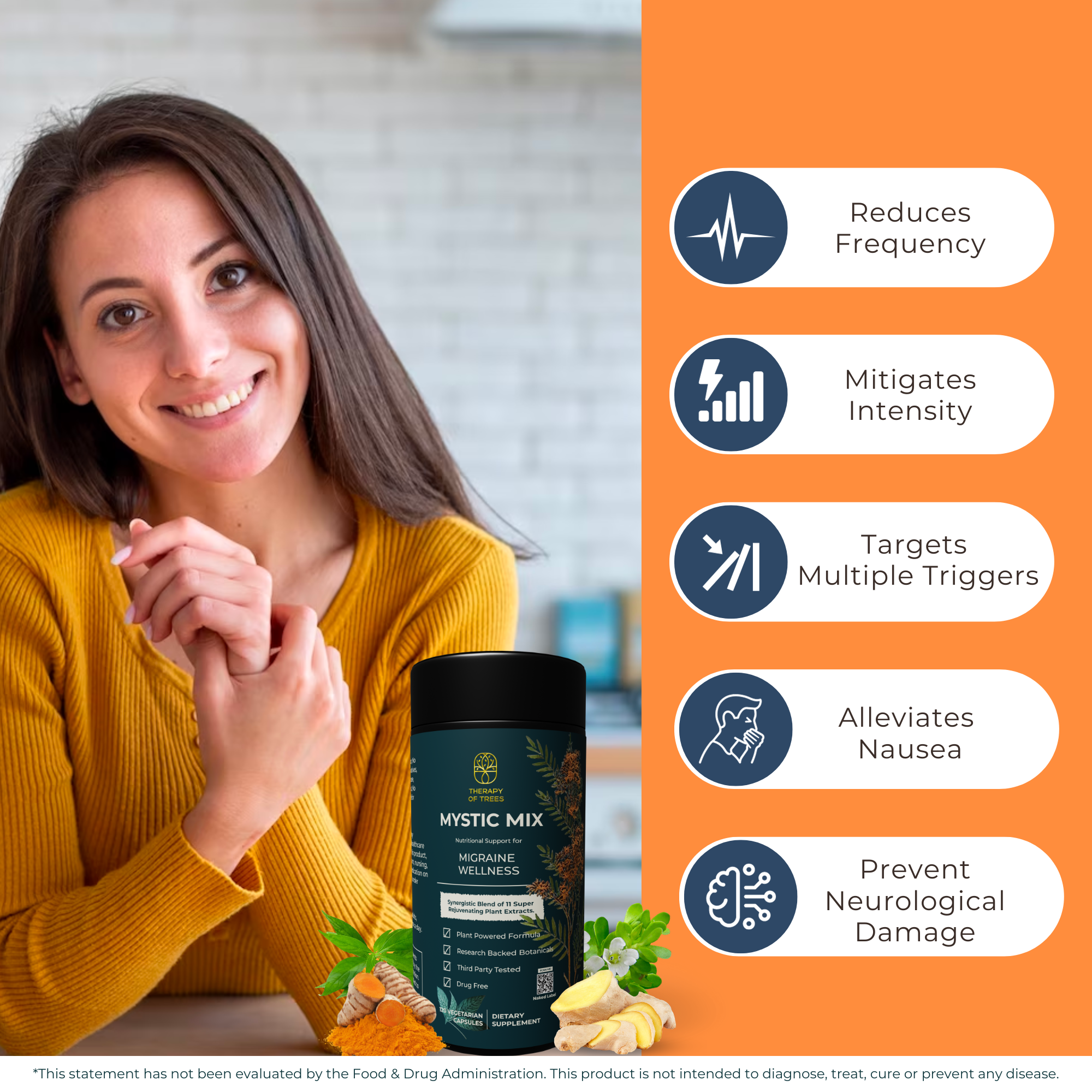 The supplement combines 11 plant extracts with research-backed health benefits, such as turmeric for improved blood flow, andrographis for neural hypersensitivity reduction, bacopa for stress reduction, ginger for nausea reduction, and more. The synergistic blend is designed to collectively address the frequency and intensity of migraines, nausea, and stress while providing potential protection from migraine-induced neurological damage.